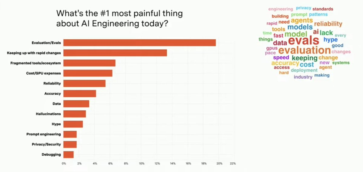 When asked about their single most painful aspect of AI engineering, evaluation tops the list—a clear signal of where the industry needs better tooling and practices.