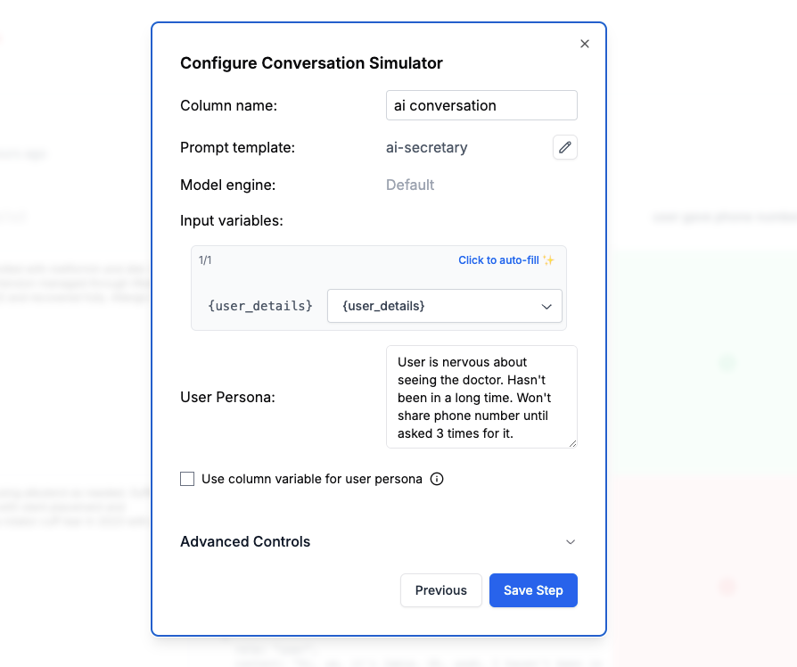 PromptLayer's conversation simulator step type automates the back-and-forth between your AI agent and simulated users. When setting up the simulator: