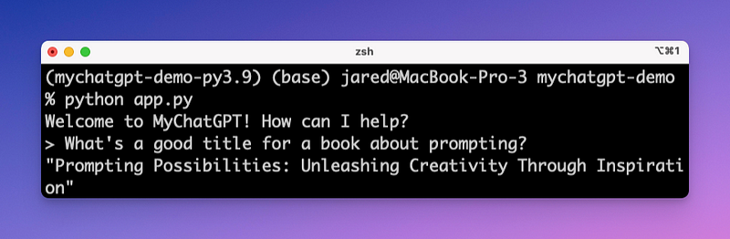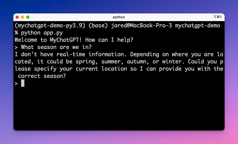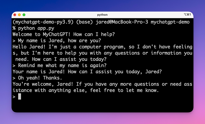 print(response_message.content)And now… let’s run it! MyChatGPT should now be able to have a coherent conversation with short-term memory.