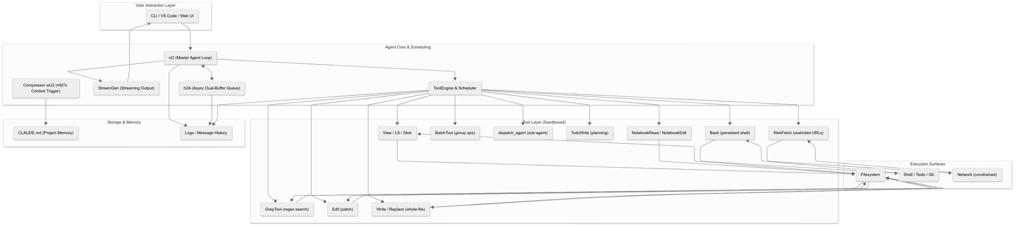 Claude Code's architecture follows a clean, layered design that prioritizes simplicity and debuggability. At the top sits the user interaction layer—whether you're using the CLI, VS Code plugin, or web UI, this is where you communicate with Claude. Below that, the agent core scheduling layer houses the brain of the system: the main agent loop engine (nO) working in tandem with an asynchronous message queue (h2A) that handles events.