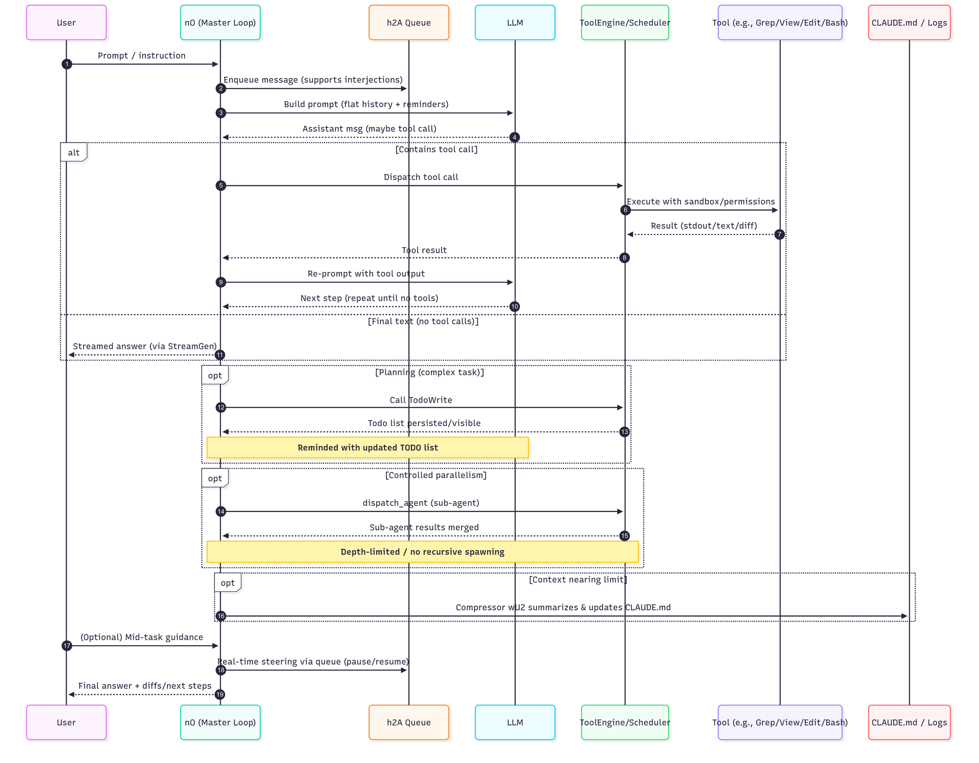 At its core lies a deceptively simple architecture: a layered system built around a single-threaded master loop (codenamed nO), enhanced with real-time steering capabilities (the h2A queue), a rich toolkit of developer tools, intelligent planning through TODO lists, controlled sub-agent spawning, and comprehensive safety measures including memory management and diff-based workflows. The thesis is straightforward: a simple, single-threaded master loop combined with disciplined tools and planning delivers controllable autonomy. A powerful systems built on the simple foundations.