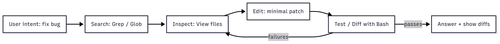 A typical execution chain might look like this: Claude receives a request to fix a bug → uses Grep to search for relevant code → calls View to read specific files → applies Edit to modify the code → runs Bash to execute tests → formulates a final answer. Each step builds logically on the previous one, creating a transparent audit trail of the agent's reasoning and actions.