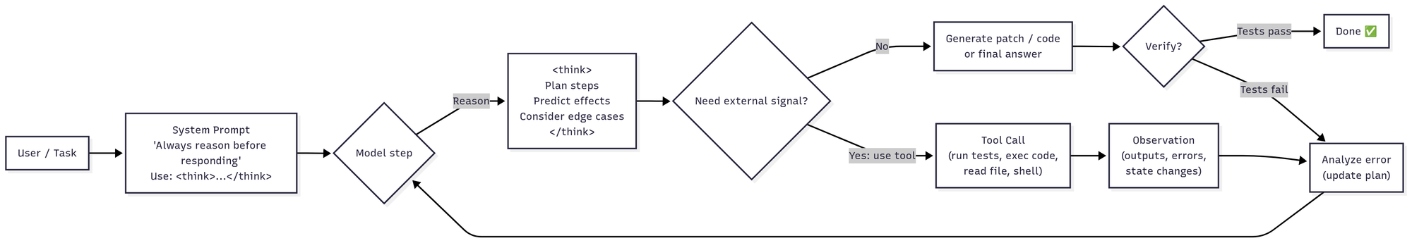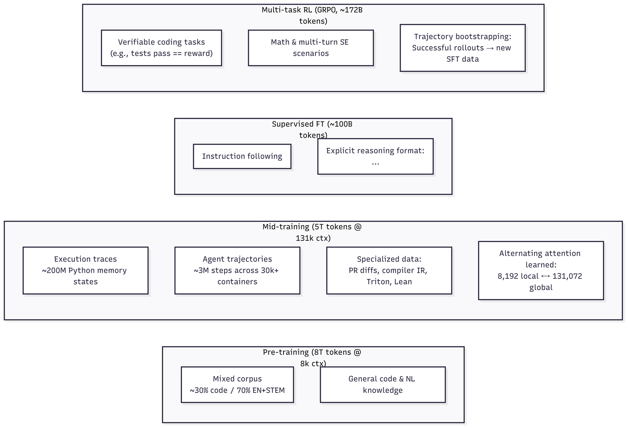 3) Post-training refined the model through supervised fine-tuning (~100 billion tokens) introducing the explicit reasoning format, followed by reinforcement learning (~172 billion tokens) using GRPO (Group Relative Policy Optimization). The RL phase involved multi-task training on verifiable coding challenges, mathematical problems, and software engineering scenarios where the model received rewards for successful outcomes like passing tests or correct solutions.