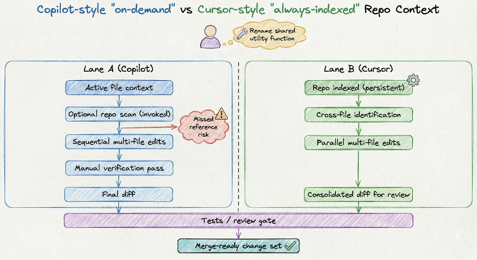 GitHub Copilot focuses mainly on the active file and requires explicit commands (like @workspace or \\#codebase) to scan the rest of the project for broader context. Cursor is built on automatic, repository-wide understanding. It continuously indexes the entire codebase. This deep context allows Cursor to handle complex, project-wide refactoring (e.g., renaming a function across the whole project, including imports and documentation) instantly with a single natural language request, giving it a significant advantage in large codebases.