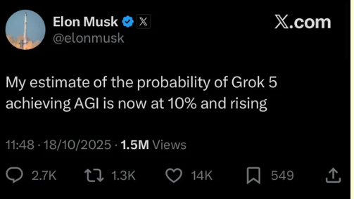 Musk's claim that Grok 5 has a "10% and rising" chance of achieving AGI demands scrutiny. He's gone further, stating "Grok 5 will be AGI or something indistinguishable from AGI"—a prediction that would make it the first system to achieve human-level general intelligence.