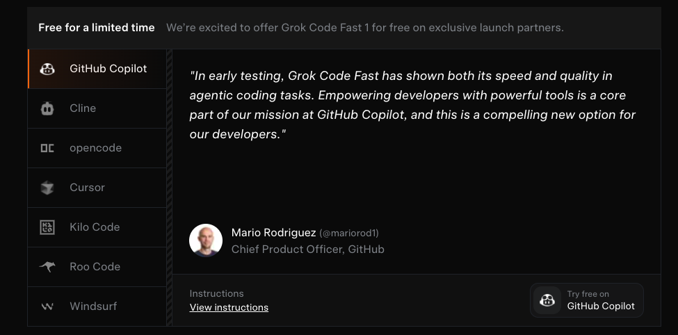 Grok Code Fast 1's wide availability makes it easy to try across multiple platforms: