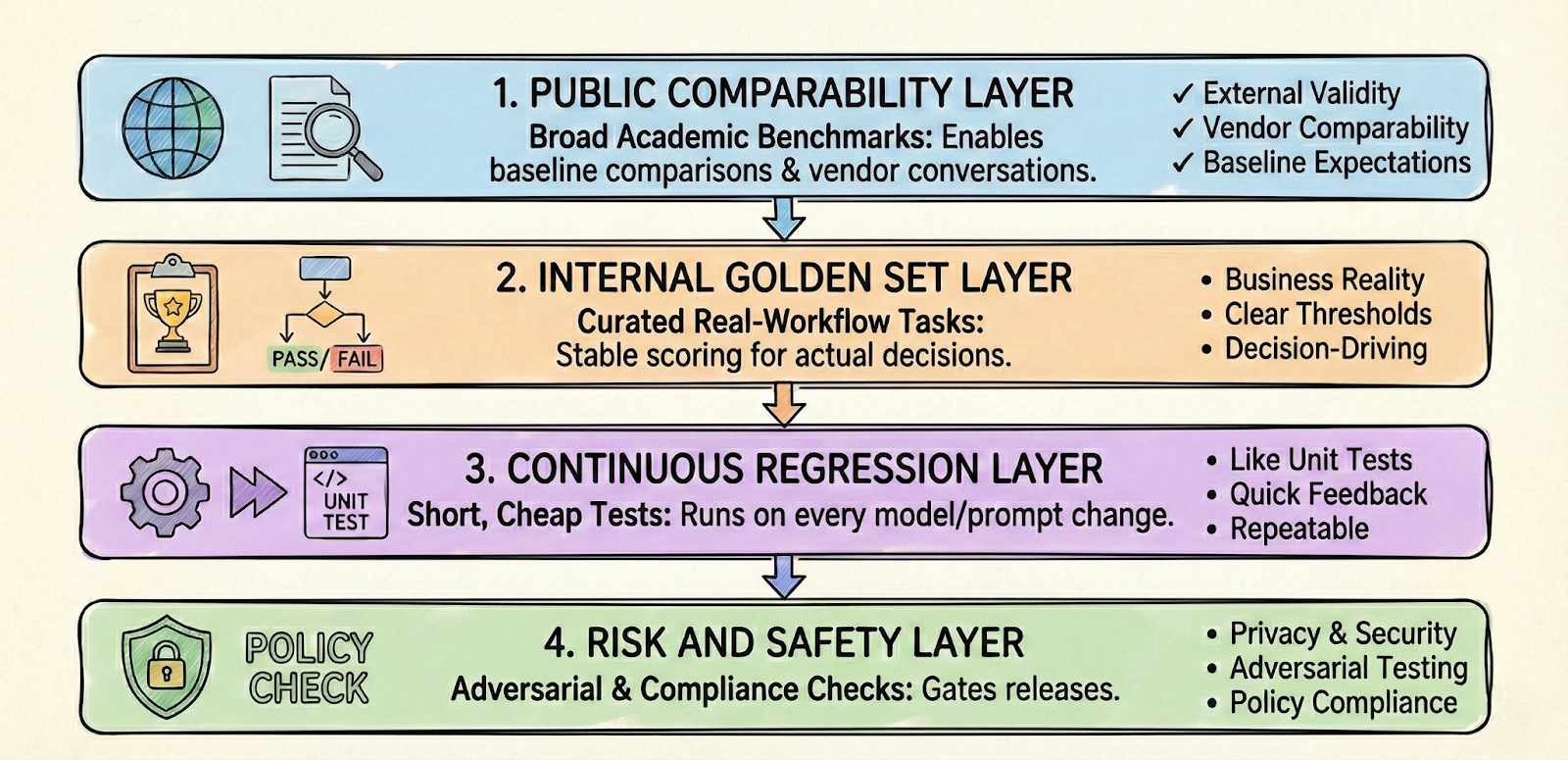 This layered approach acknowledges a fundamental tension. Public benchmarks provide comparability across vendors and models, but they rarely capture what matters for a specific organization's use cases. Internal evaluations capture business reality but lack external validity - the solution is building infrastructure that supports both.