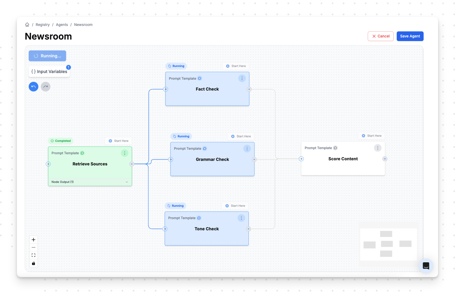 Collaborator Newsroom puts journalists and editors first. It re-versions inputs ranging from broadcast scripts, web stories, reporter notes, official documents, press releases, and transcriptions into web, social, push, and summarized outputs. Simultaneously, an eight-step Analyze workflow runs, offering journalists instant expert feedback on their content, based on quality standards set by Magid's Journalism Advisory Board. PromptLayer handles the agentic orchestration—retrieving exact quotes, coordinating RAG calls, and versioning every prompt so the team can roll back in one click.