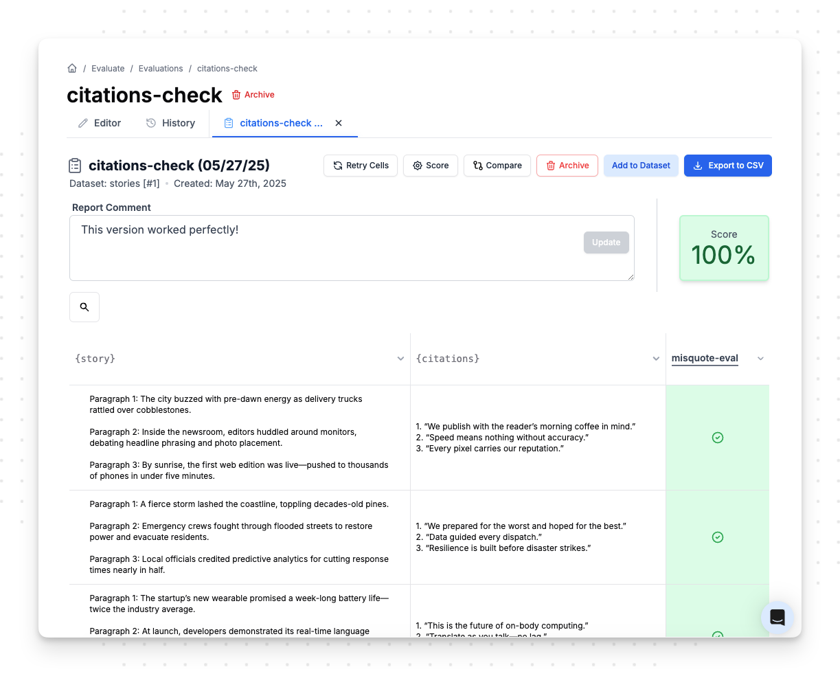 - Custom eval dataset: 100+ human-graded stories per station act as ground truth; PromptLayer batch runs compare prod against latest WIP prompts.