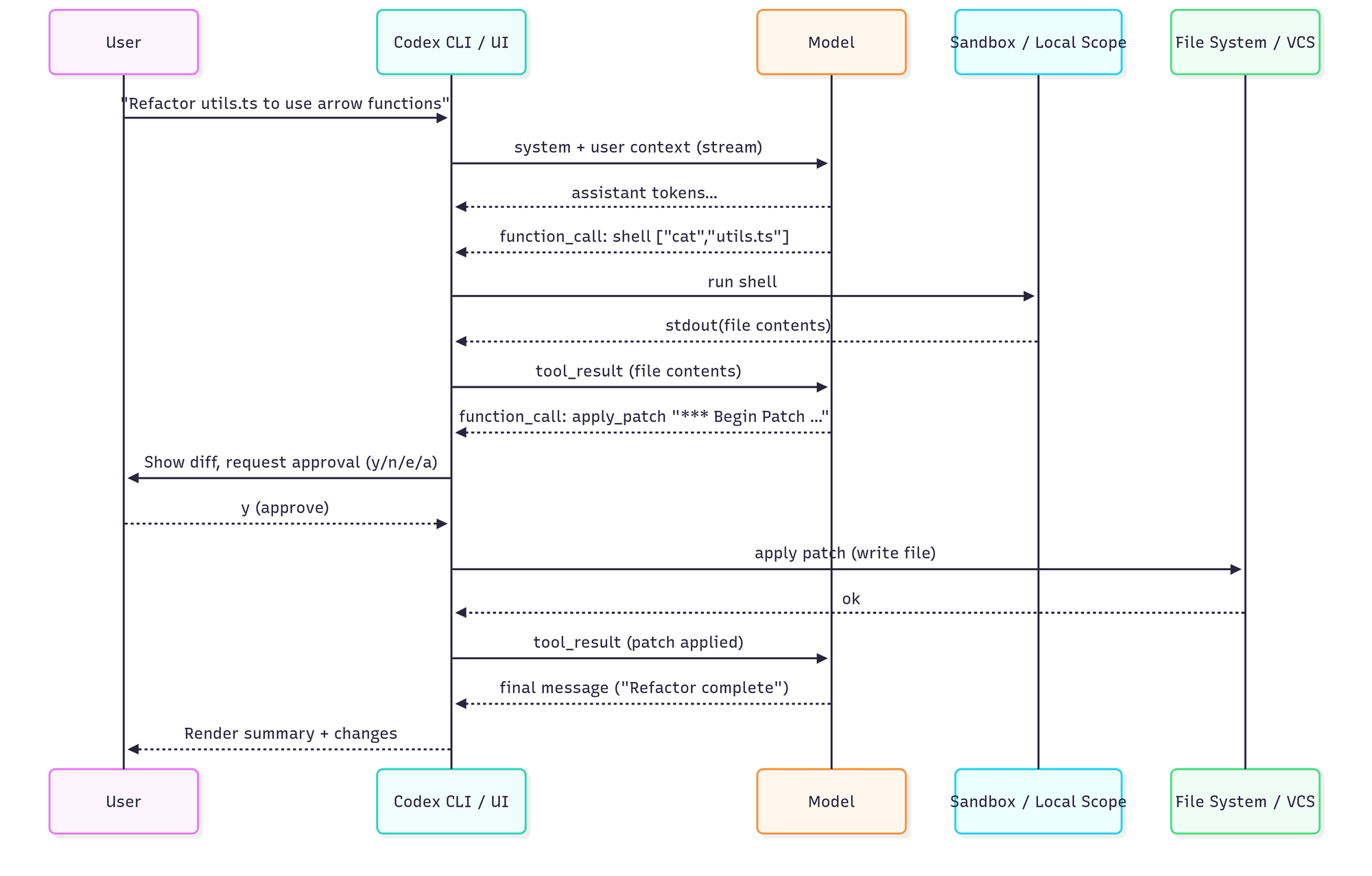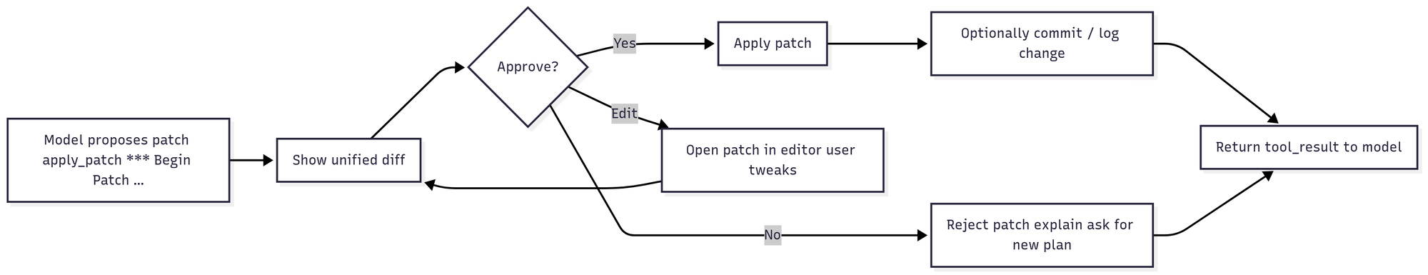 File editing deserves special attention. Rather than outputting entire file contents, Codex generates unified diffs marked up in a specific format. The CLI intercepts apply_patch commands and processes them internally, displaying colorized diffs (red for deletions, green for additions) for user review. Users can approve, reject, edit, or approve all.