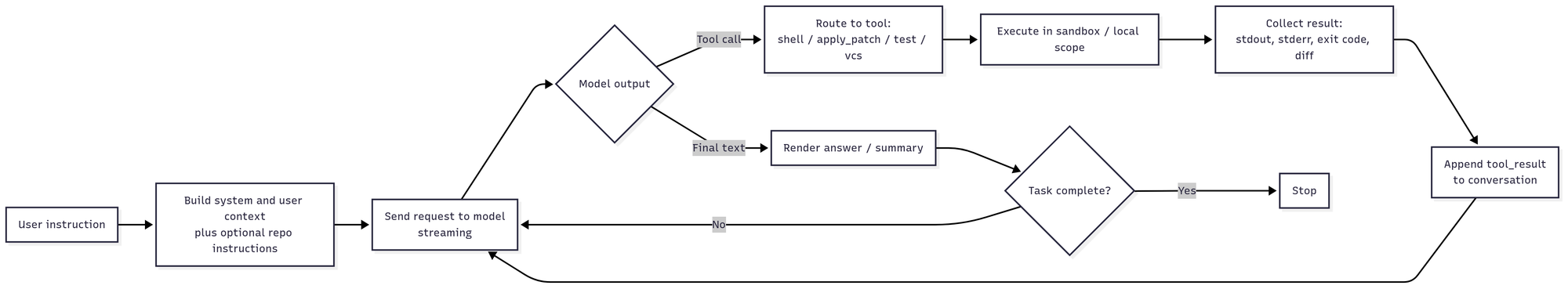 At its core, Codex CLI operates on a single-agent, ReAct-style loop implemented in the AgentLoop.run() function. This design pattern—Think → Tool Call → Observe → Repeat—continues until the model produces a final answer without additional tool requests.