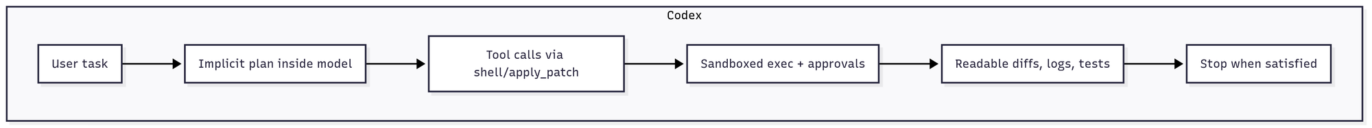 It also bakes in safety and UX in the prompt: default sandbox/no-network assumptions, clear approval gates for risky commands, and instructions to verify changes by running the project’s own checks before declaring success. Planning is implicit—Codex is nudged to iterate (read → edit → test) instead of producing a big upfront plan—while the diff/approval path keeps humans in control. Codex favors a small, auditable patch loop powered by ordinary UNIX tools, with policy and guardrails encoded directly in the system prompt.