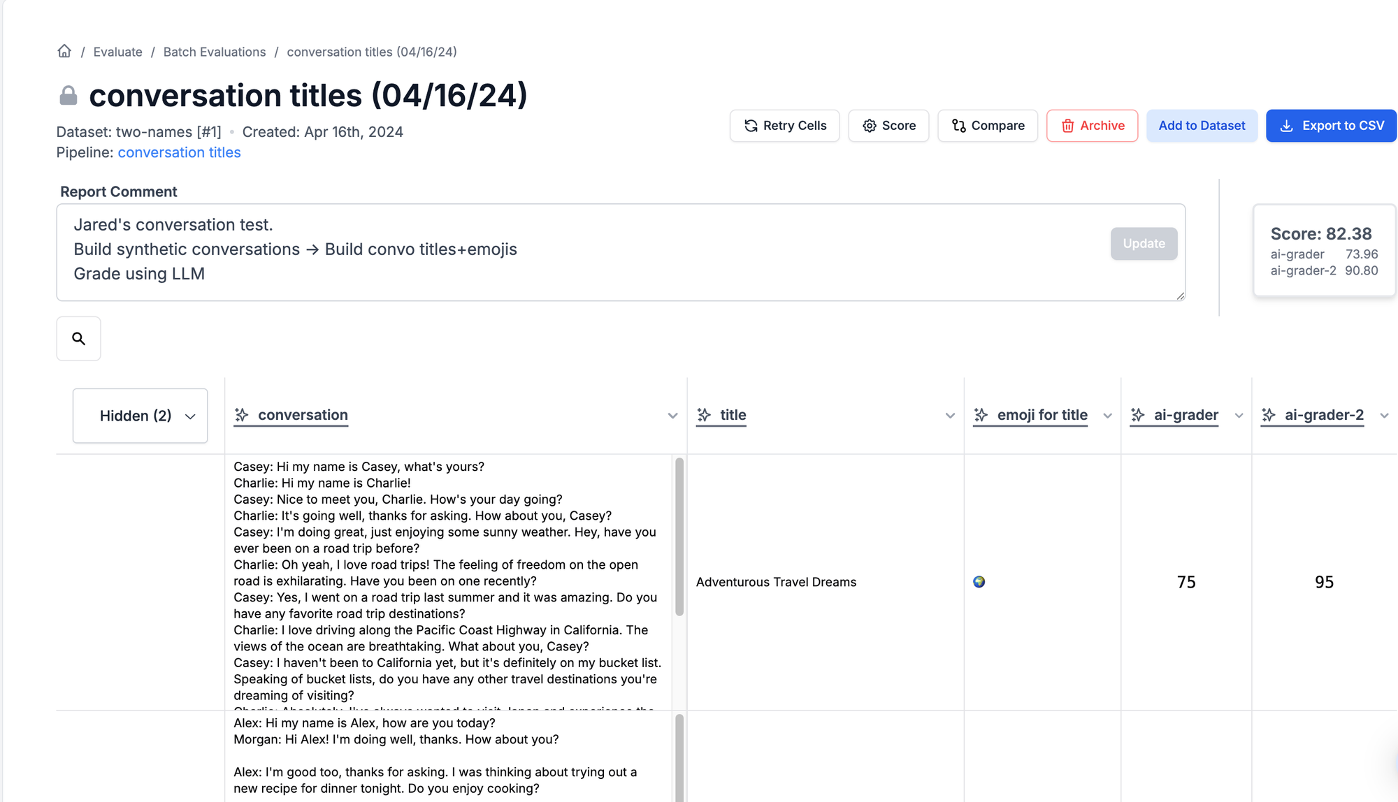 A common question we hear is about creating systems where AI evaluates itself through conversation. While this has its place, we recommend freezing conversations at specific points (using our placeholder feature for example) and evaluating those discrete steps, applying the methods above.