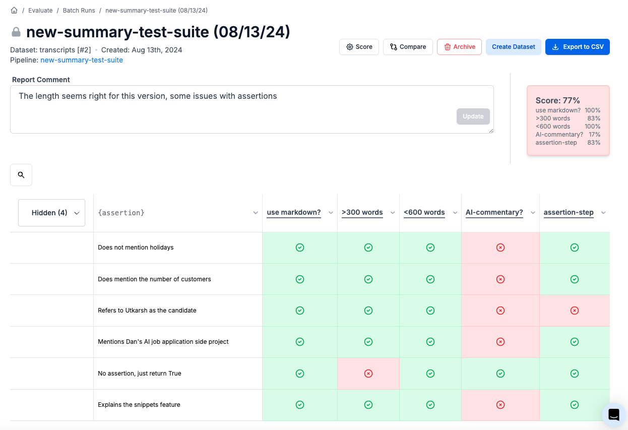 For example, if your model sometimes forgets to mention key information like "Tim" from a call transcript, you might write an assertion: "Make sure Tim is mentioned in this response." Over time, you'll build hundreds of these assertions across dozens of inputs, creating a robust evaluation framework.