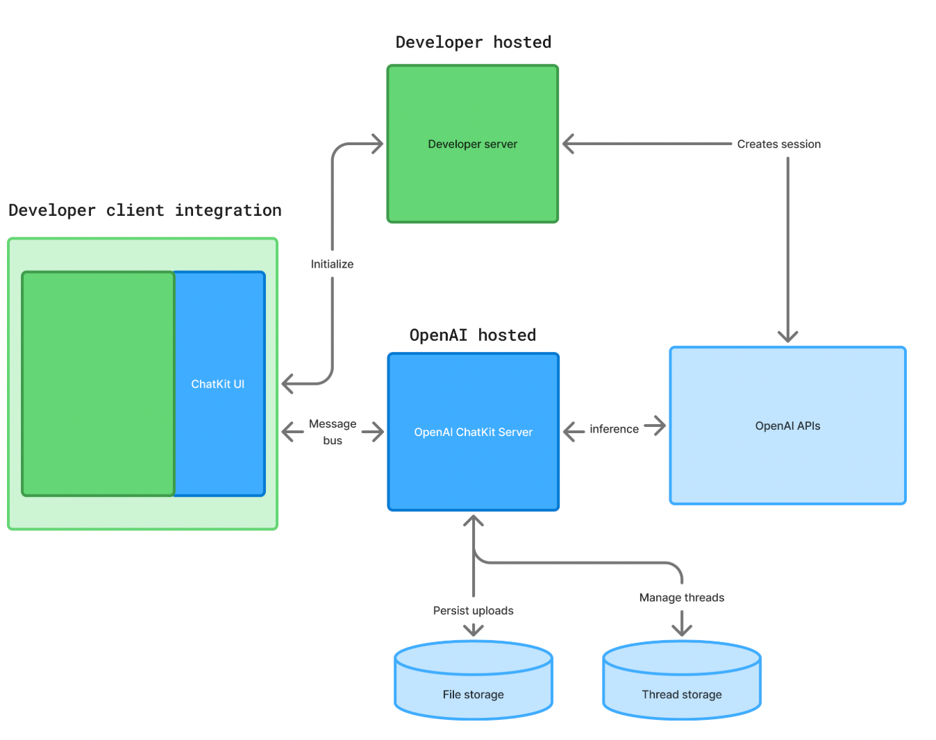 ChatKit is framework-agnostic, it works equally well with React, Vue, or plain JavaScript. The framework automatically handles the complex parts of chat development: message threading, response streaming, and UI state management.