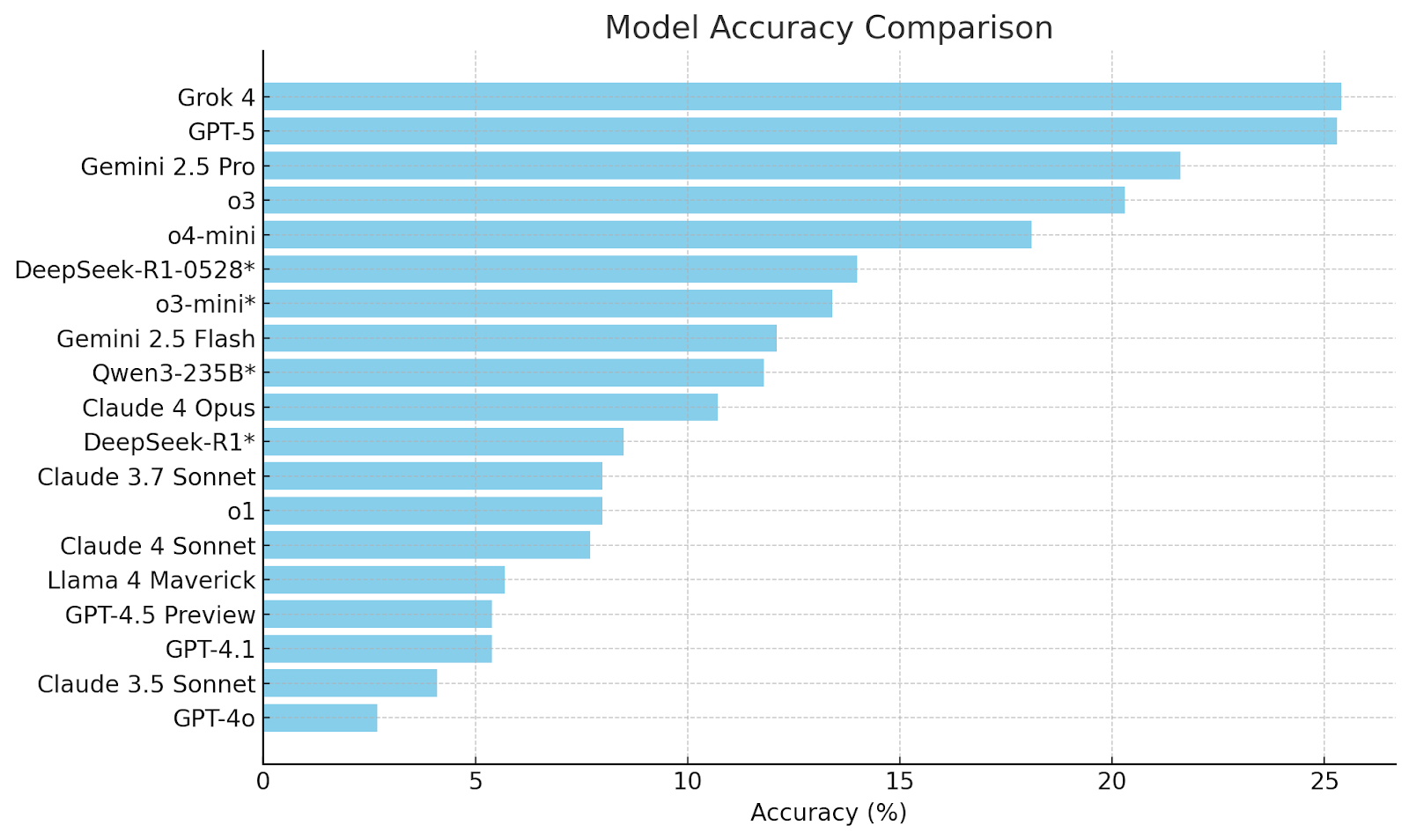 - Leading the pack: xAI's Grok 4 currently holds the top position with approximately 25.4% accuracy, though this marginal lead highlights how challenging the benchmark remains.