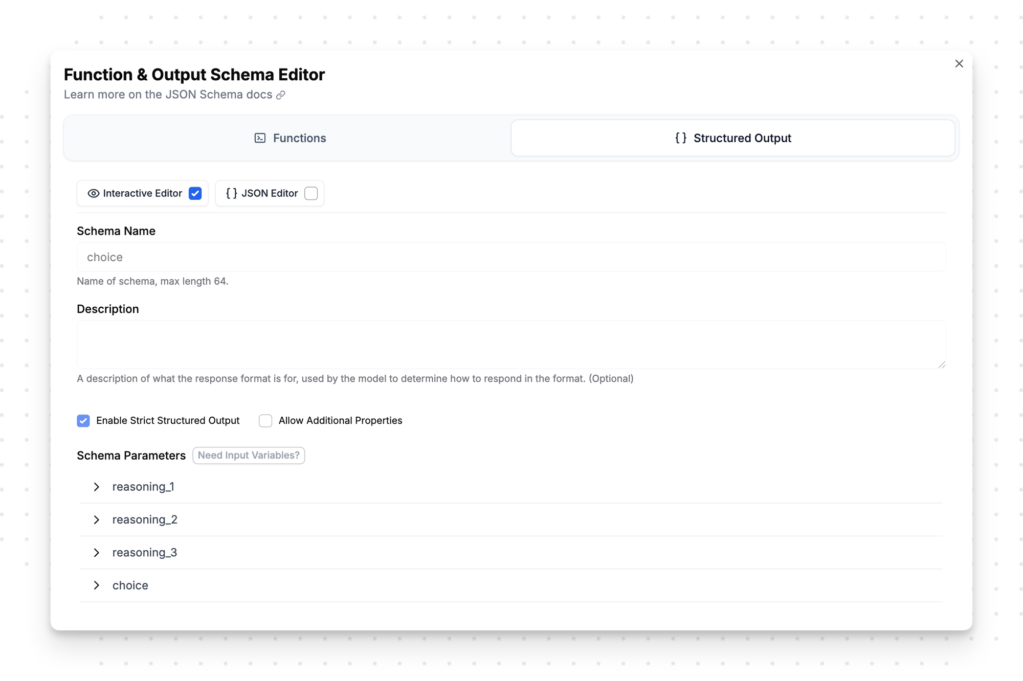 PromptLayer even has an interactive editor for defining structured output JSON. See screenshot below.