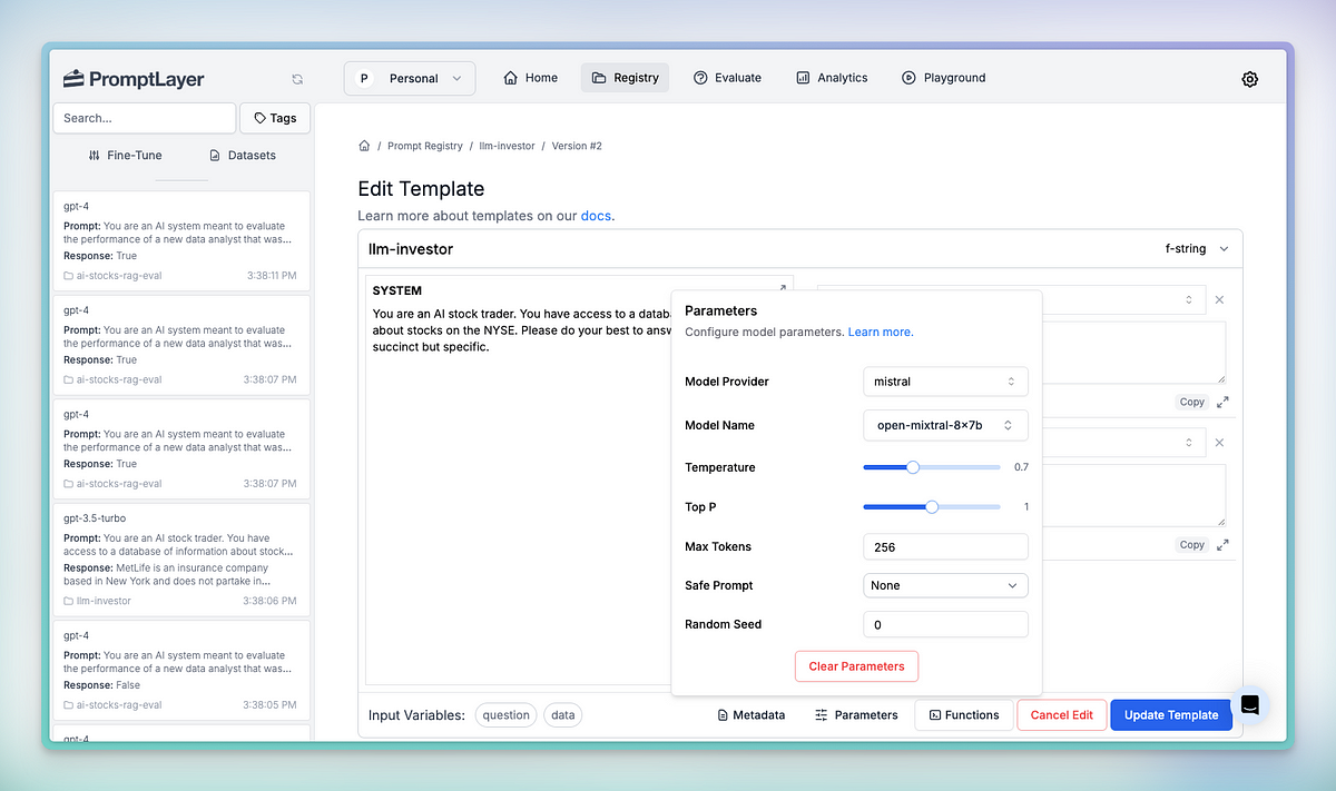 Now that we have done some investigation, let’s update our prompt template! This is simple with PromptLayer, just click “Parameters” and change the model to Mistral.