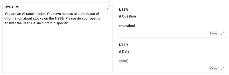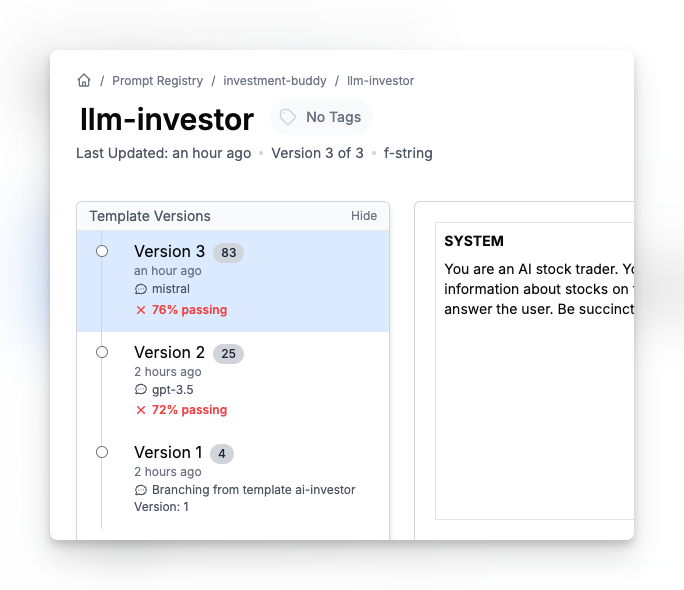 Our LLM investor is designed to take in a user question, retrieve data from a RAG pipeline, and then respond with the answer. We already have set up an eval for this prompt using a hand-curated dataset of sample questions and ground-truth answers. This prompt works well already, but let’s see if it will perform better with Mistral.