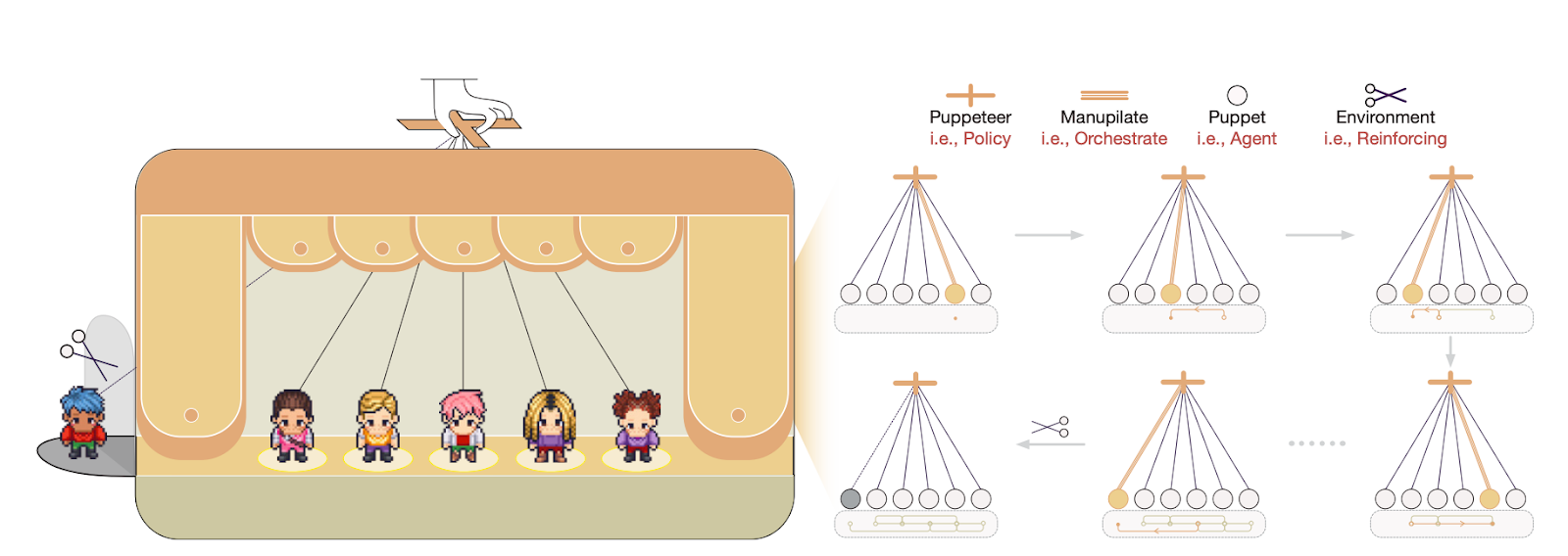 - Agent workflows provide the substrate. Chains of model calls, conditional branches, and tool integrations form the action space the orchestrator selects from.