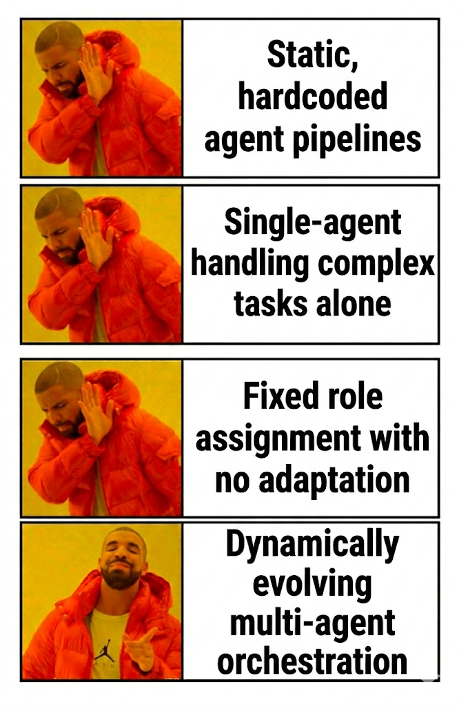 - Dynamic selection replaces fixed sequences: The orchestrator acts as a policy network, routing tasks to agents based on context. If a simpler agent can handle a subtask, it gets called. If complexity escalates, a more capable model takes over. The system builds coordination patterns on the fly rather than following a script.