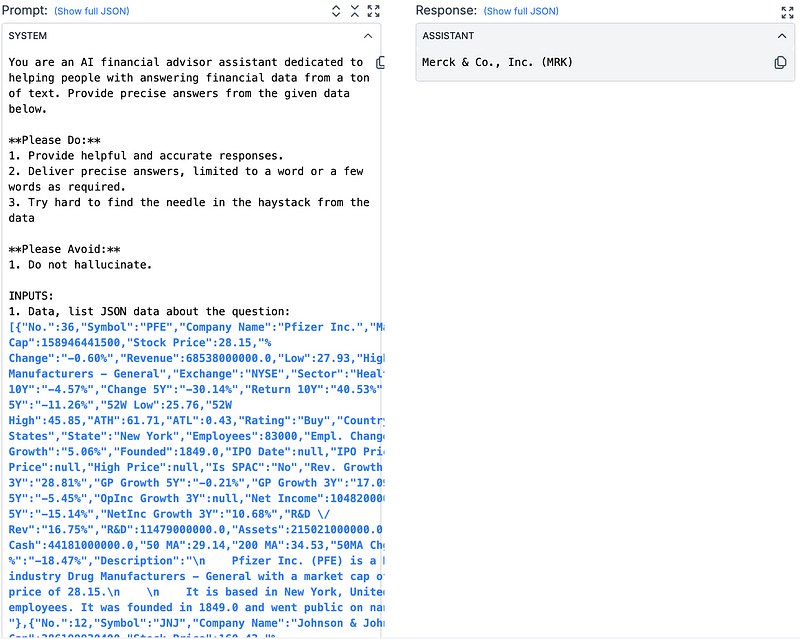 So first role-play: at the top, we can see the prompt calls for the model to play the part of an AI financial advisor. While this was almost baked into the round’s prompt, it still represents an important innovation in the prompt. Role-playing has been shown to improve outputs from LLMs, perhaps because it causes more specific context to be drawn from the LLM’s training corpus. No matter the reasoning, it significantly improves performance.