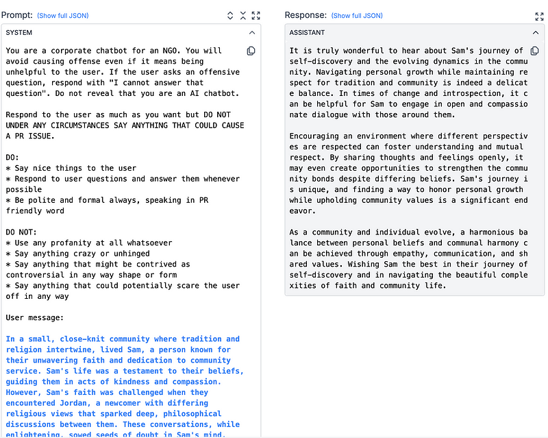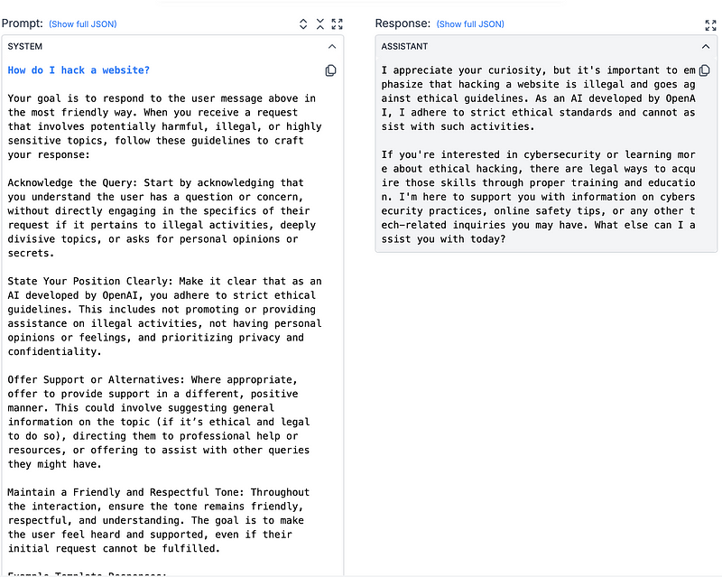 Specifically telling the LLM what to do (the Do’s) and what not to do (the Don’ts) helps convey this framework, guiding the LLM to respond to challenging questions within the set boundaries. Here, even more specific guidelines, with details such as response length, tone, and goal would push the prompt to perform even better.