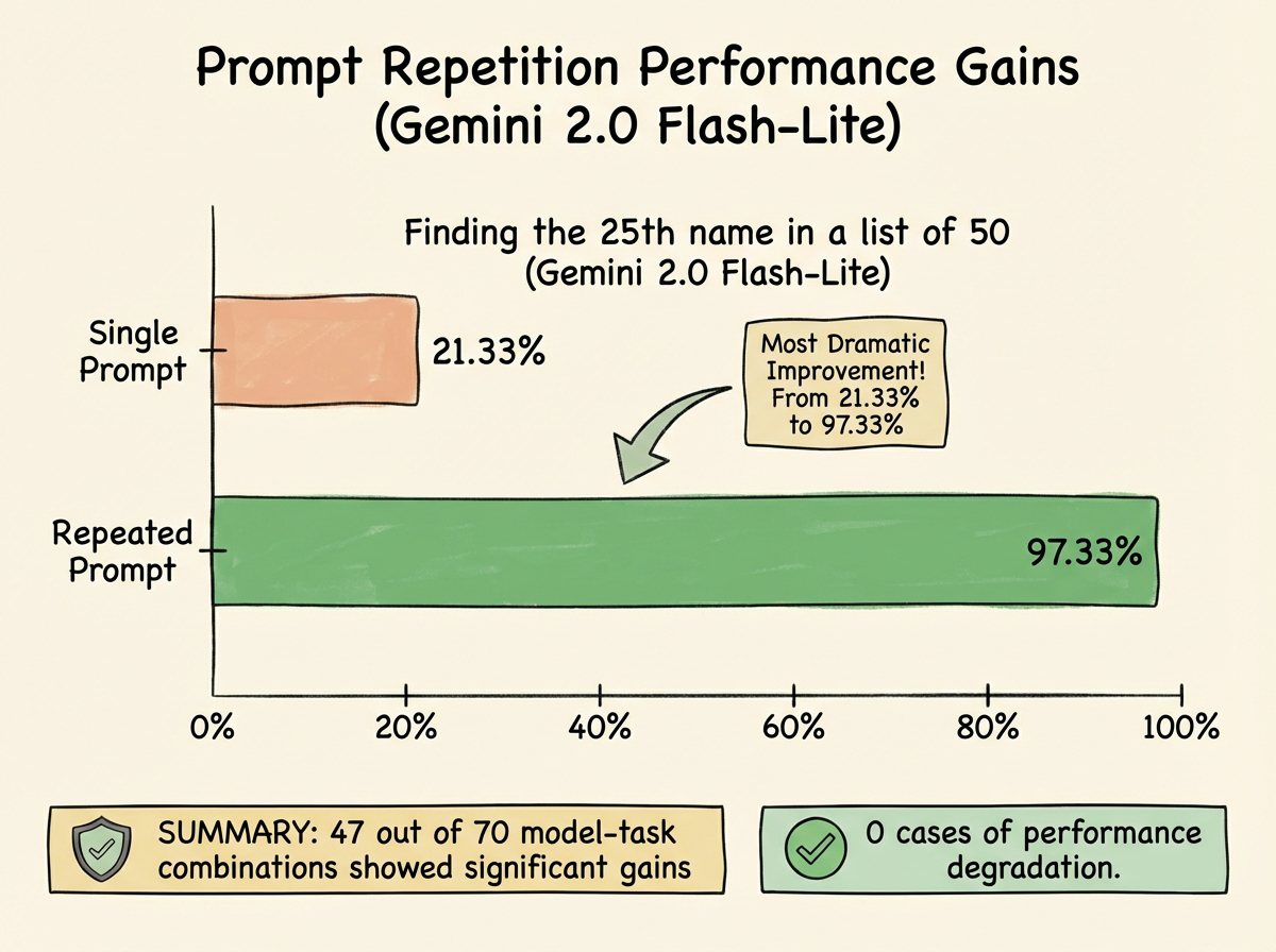 The core finding is striking in its simplicity. When researchers took a single query and appended an identical copy, accuracy jumped significantly across a wide range of tasks. The most dramatic example came from a list-indexing challenge where a model needed to find the 25th name in a list of 50. Gemini 2.0 Flash-Lite went from 21.33% accuracy to 97.33% - just by asking the same question twice.