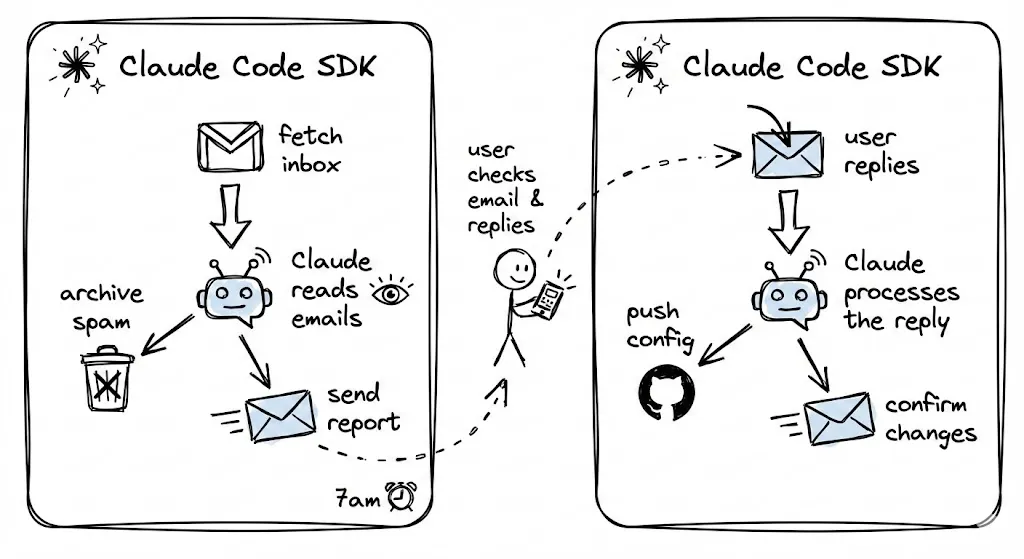 Debra is an automated email secretary that runs on a daily cron. She fetches my recent inbox, classifies senders, reads and summarizes important emails, archives spam, and sends a morning report. I can reply in plain text to approve classifications or make changes, and the system updates itself via git push.