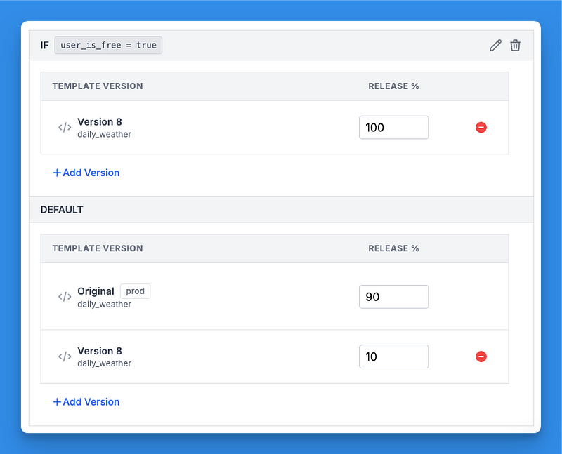 If desired, you can also add user segments to define which version each segment receives. Segments use request metadata, like user ID or company. As an example, you could specify that internal employees get v4 (dev) 50% of the time.